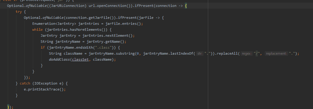 可以看到红色框框内有俩if(object!=null)的判断,算上上面的url!=null总共三个非空判断。说实话,写习惯JavaScript的我现在看到这个代码就有点脑壳痛了。这种if(true) 执行,false不做执行的代码块,在JavaScript里面比较常见用链式写法,类似于 a.isNull( input => { doSomething() return result; } ).then(result => result === null).then(condition => {});这种链式写法在我眼中更简介,在读代码的时候不会因为一个!=null就脑子一卡。所以在写功能之前,我想先找办法把这个大量非空判断解决掉。